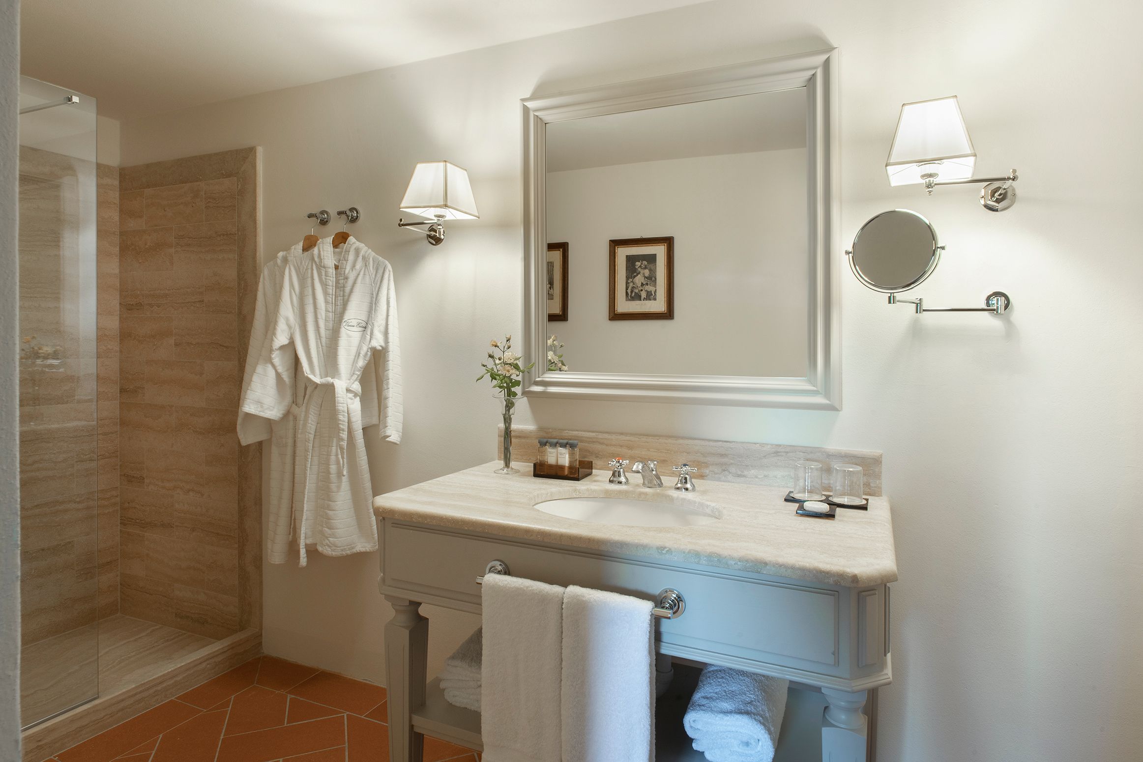 Adjacent to Villa Gelso is Il Roseto, a recently renovated barn featuring three stunning double bedrooms, all complemented by en-suite facilities and a communal entrance. The outdoor spaces of Villa Gelso are equally impressive, comprising the Belvedere panoramic terrace, providing sweeping views of the picturesque Balze del Valdarno, and a vast garden featuring a central swimming pool surrounded by fragrant roses. The outdoor lounge area is the perfect spot to soak in the vibrant colors of the Tuscan countryside. With dedicated staff providing impeccable service, guests are ensured a truly homely experience.